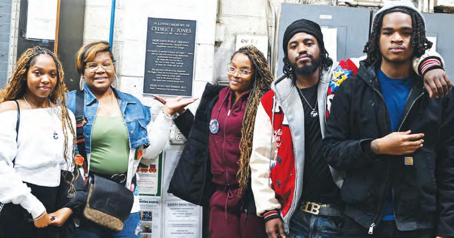LEFT: Debbie Swofford, event organizer, places a flower on the Project Blue Light wreath. One can show support for police and fire this winter by placing a blue light and red light, respectively, in their front window.