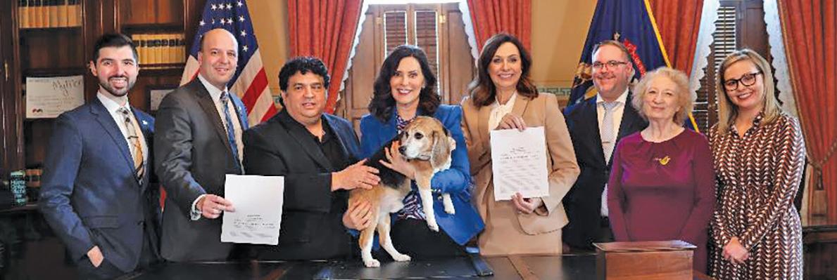St. Clair Shores City Councilman David Rubello, center, with his beagle, Teddy, joined Michigan Gov. Gretchen Whitmer in her Lansing office on Feb. 6 for a ceremonial bill signing for “Teddy’s Law.” The package of bills, sponsored by state Sen. Kevin Hertel, second from left, D-St. Clair Shores, and state Sen. Dayna Polehanki, D-Livonia, to the right of the governor, requires research facilities to offerdogs or cats that would otherwise be euthanized to an animal shelter for adoption, and itestablishes penalties for failing to do that.