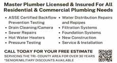 35-YearsExp.Seniors/ Military/Multi-TaskDisc. Free-Est.•DrainCleaning •PlumbingRepairs/ Fixtures•SumpPumps/ WaterHeaters.Lic/Ins. apexplumbers corporation.com Lic#8111771