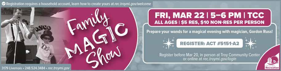 4B - TROY TIMES, March 7, 2024 www.candgnews.com *With Approved Credit. See Dealer for Details. **With some restrictions. Offer expires 4/2/2024. 2600 W. Maple Rd., | Troy Motor Mall | deansellersford.com 248-643-7500 0138-2410 2023 FORD MUSTANG MACH-E 0% AVAILABLE * Up to $12,600 MSRP Reduction Up to $3000 Rebate or 0% Financing Available. 3.9% AVAILABLE * 2023 FORD F-150 LIGHTNING 3.9% Financing Available or Up to $12,500 Retail Bonus Cash! FORD ELECTRIC VEHICLE CERTIFIED ELITE DEALER OVER 37 IN STOCK BENEFITS OF OWNERSHIP Come See the Dean Sellers Ford EV Sales & Service Specialist Team • Complimentary Home Delivery** • Pick Up and Delivery w/complimentary loaner for Service Events • Complimentary Exterior Wash • Complimentary Re-Charge of vehicle** Certificate of Completion Awarded To: DEAN SELLERS FORD EV SALES SPECIALIST Has Successfully Completed ELECTRIC VEHICLE UNIVERSITY DEAN SELLERS MARCH 8-10 ‘Willy Wonka Jr.’: Performed by Junior Actors of Ridgedale, 7 p.m. March 8-9 and 3 p.m. March 9-10, Ridgedale Players, 205 W. Long Lake Road in Troy, ridgedaleplayers.com MARCH 9 Grief seminar: Also Q&A, 10 a.m.-noon, St. Augustine Lutheran Church, 5475 Livernois Road in Troy, RSVP to (248) 879-6400 MARCH 10 The Fourteenth Amendment, Section 1: Presentation at 2 p.m., Section 2 to be held April 14 and Section 3 May 5, Troy Historic Village, 60 W. Wattles Road, registration required, troyhistoricvillage. org/programs/constitution-cafes MARCH 13 Troy/Birmingham/Bloomfield Senior Expo: Meet local organizations and experts, also free health screenings, giveaways, prizes and refreshments, 10 a.m.-1 p.m., San Marino Club, 1685 E. Big Beaver Road in Troy, (248) 524-4868 MARCH 16 Free clothing giveaway: For men, women and children, 9:30 a.m.-1 p.m., Calvary Chapel of Oakland County, 175 E. Long Lake Road in Troy, (248) 457-9673 MARCH 21 Walking group: Travel 1.25-3 miles past Upton House and through Dodge Park with option to pick up trail along Clinton River, 5 p.m., meet at Sterling Heights Public Library, 40255 Dodge Park Road, info@thvmail.org, (248) 524-3570, troyhistoricvillage.org MARCH 22 ArtWalk at MDC: Artists open house (10 a.m.-3 p.m.), presentations (11 a.m. and 1 p.m.) and live demonstrations (noon-1 p.m.), Michigan Design Center, 1700 Stutz Drive in Troy, michigandesign. com/event/art-walk-mdc MARCH 28 The Delicious History of Detroit-Style Pizza: Presentation at 2 LIST YOUR EVENTS IN COMMUNITY CALENDAR — FOR FREE! 1 2 3 Create a CitySpark account using your name, email and password Fill in your event information, click “Review,” then “Submit and Finish” Visit candgnews.com/calendar or use this QR code Events should appear online within 2 hours. We’ll use them in print as space permits. Login information is for account purposes only. ALSO, GO ONLINE THURSDAYS FOR: Questions? Email calendar@candgnews.com “YOUR GUIDE TO THE WEEKEND’S EVENTS!” then click or COMMUNITY CALENDAR p.m., Troy Historic Village, 60 W. Wattles Road, registration required, troyhistoricvillage.org/programs/teas-at-two ONGOING Fish fries: 4:30-7:30 p.m. Fridays until March 29, St. Andrew’s Society of Detroit, Kilgour Scottish Centre, 2363 Rochester Road in Troy, detroitscots.com, (248)