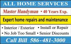 Kitchens/ Cabinets/ Countertops MR.BACKSPLASH ·CUSTOM BACKSPLASHES ·CUSTOMKITCHENS ·COUNTERTOPS *Granite*Quartz* ·CustomBathrooms ·TILEREPAIRS *FREEESTIMATES* 586-552-5416 mrbacksplash.com Landscaping & Water Gardens ALLTIMATE OUTDOORSERVICES DrainageSystem Professionals Big/SmallJobs, Yard-Drainage,Grading, Sod/Seed,Retaining Walls/Walkways/Patios, Senior/Military-Discounts Credit-Cards-Accepted Free-Estimates 586-719-1202