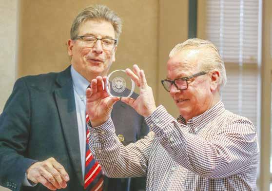 Retiring Grosse Pointe Shores Assistant City Manager Tom Krolczyk, right, admires a crystal embellished with the city’s emblem that was presented to him during his retirement party March 27 by Mayor Ted Kedzierski, left.