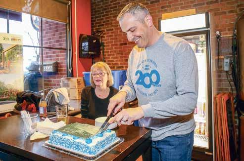 ABOVE: Farmington Mayor Joe LaRussa cuts a cake in celebration of the anniversary date of Farmington’s bicentennial March 8. BOTTOM LEFT: Kathy and Kelsey MacDonald of Farmington Hills show their 1824 glasses in recognition of the founding of Farmington on March 8, 1824. BOTTOM