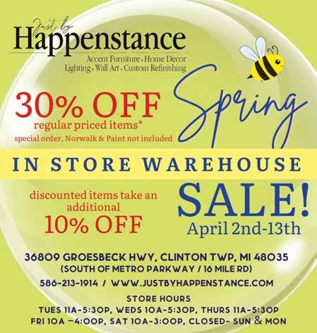 0248-2414 0369-2408 15353 Hall Road | Macomb, MI (N.E. Corner @ Hayes) MON., FRI., SAT. 9-5PM | TUES., WED., THUR. 9-8PM • 586.532.7900 PRO QUALITY FLOORING ★ Carpet Rolls & Remnants, plus Mill Direct Savings ★ Luxury Vinyl Flooring — Wood & Tile Designs • Kid & Pet Friendly • Waterproof • Easy to Clean ★ Large Jobs or Small — Installation is Available ★ Hardwood & Laminate Flooring Specials, too! Spring Clean Up — Inventory Clearance
