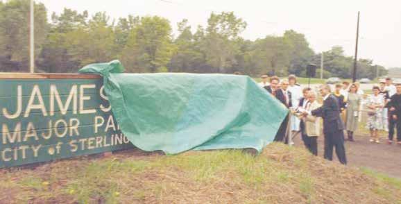 A sign for James C. Nelson Park is unveiled during a dedication ceremony in August 1990.