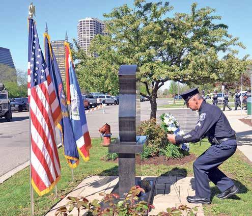 The Southfield Police Department held a ceremony remembering fallen officers at the Southfield city hall campus on May 9. The event offered “a chance to pay tribute, reflect, and show our support to the families and colleagues of those who gave their lives to protect and serve,” according to a Facebook post from the department. LEFT: Southfield Police Specialist Nick Cazan places a wreath at a monument honoring fallen officers Donald L. Harding and James W. McMahon. BOTTOM LEFT: The Southfield Police Honor Guard stands at attention. BOTTOM RIGHT: People listen to the thoughtful comments of guest speakers.
