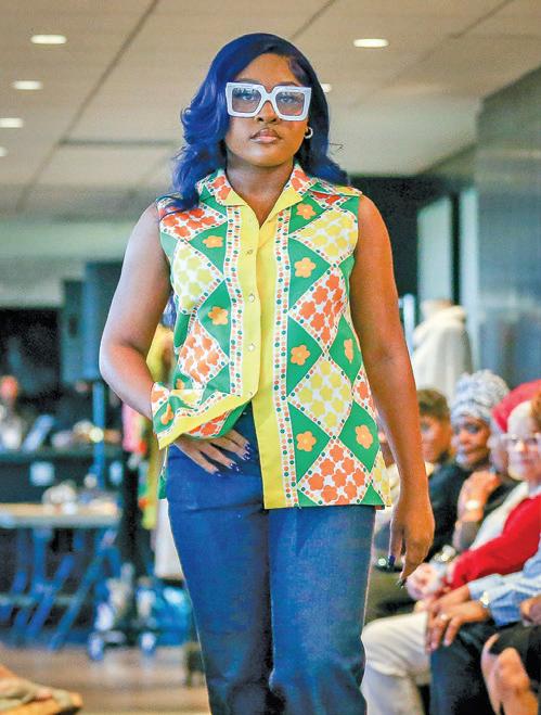 LEFT: Kymiah Glass, from the Southfield A&T dance team, struts the runway in a late 1960s groovy mod sleeveless top by Alex Colman, from Fantoni.