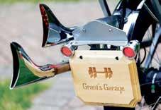 Each part of the bike serves a purpose. Two batteries help make the e-bike run. A larger battery is for propulsion, which David said is the pedal assist. A smaller battery operates the LED lighting system, which includes glow lights of different colors. The e-bike features fishtail exhaust pipes, and David even purchased a stars-and-stripes helmet like Fonda’s “Easy Rider” character. The license plate reads “Grant’s Garage.”
