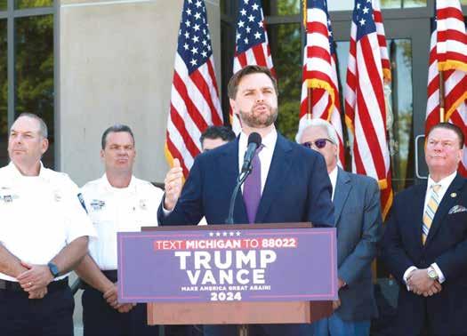 SHELBY TOWNSHIP — Surrounded by local law enforcement and airing his intent to “back the blue,” Republican vice presidential candidate and U.S. Sen. JD Vance stopped by the Shelby Township Police Department Aug. 7 to pitch Republican presidential candidate Donald Trump’s campaign platform on crime, immigration and more.