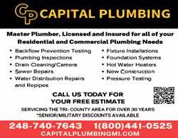WATERWORK Plumbing.com •DrainCleaning •SewerCamera •WaterHeaters •SumpPumps •BackflowTesting 248-542-8022 SameDayEmergency ServiceAvailable Reliable/Experienced License#8003885