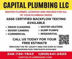 4B - ROYAL OAK REVIEW, August 9, 2023 www.candgnews.com Plumbing OwnedFamily& Operated 888.572.0928 586.585.1862 www.MotorCityPlumber.com Motor City Plumbing & Drain Repairs & Installation Master Plumber • Fully Licensed & Insured Senior Citizen & Military Discounts 100% Guarantee Financing Available FREE Camera with Drain Cleaning Restriction May Apply $50 OFF Sump Pump Installation $30 OFF Any Plumbing Service 0355-2235 0147-2326 FREE ESTIMATES! • DRAIN CLEANING LEAK REPAIRS • BOILERS 586-477-7777 • WATER HEATERS • DISPOSALS SUMP PUMPS Licensed & Insured EAplumbinganddrain.com Servingthe Macomb & OaklandCounty Areas! Contact us anytime! EMERGENCIES HAPPEN! We Stay Open 24/7 To Handle Any Plumbing Problems Day Or Night! We offer senior, military, and new customer discounts! • REMODELS & MORE 0335-2330 Painting 0325-2302 Call Frank 248-303-5897 • Wood Repair • Power Wash • Free-Estimates REFERENCES AVAILABLE 2 BROTHERS PAINTING Complete Interior/Exterior NEWS AND NOTE ITEMS TAKEN FROM AROUND OUR COVERAGE AREAS AND NOTES NEWS