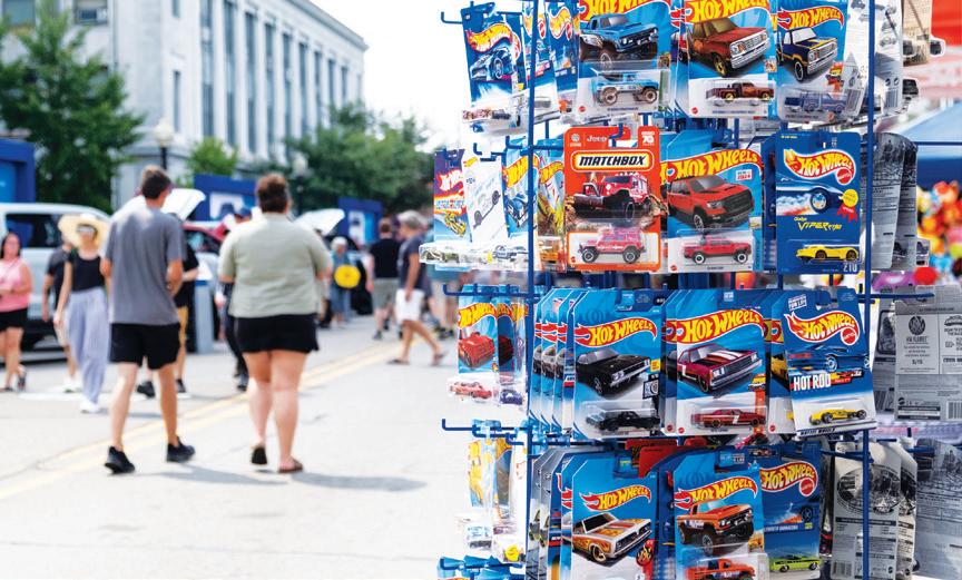 TOP LEFT: Two Boss 302 Mustangs are on display in Mustang Alley during the Woodward Dream Cruise. BOTTOM LEFT: Thousands of people visit Ferndale to check out Mustangs, Broncos and more during the Dream Cruise on Saturday, Aug. 16. ABOVE: Visitors walk past a line of Ford Broncos on display in the Bronco Corral during the Woodward Dream Cruise. RIGHT: Hot Wheels toys are seen for sale at a vendor booth in Mustang Alley during the Woodward Dream Cruise.