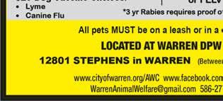 Vaccination clinic: Also microchips for dogs and cats, 9 a.m.-2 p.m., Warren Department of Public Works, 12801 Stephens Road, (586) 275-5181, warrenanimalwelfare@gmail.com, cityofwarren.org/awc