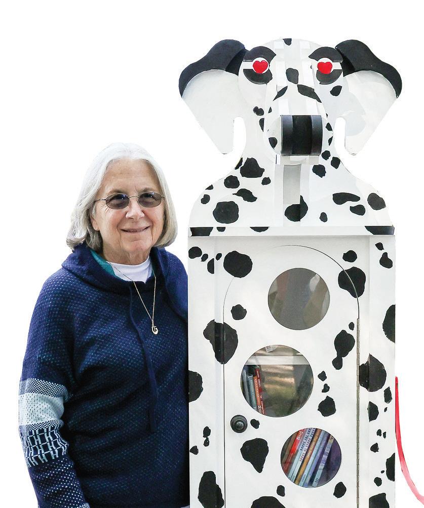 Within the outdoor library is a bookcase, painted to look like a dalmatian. The design is a reference to its location — right by the fire station.