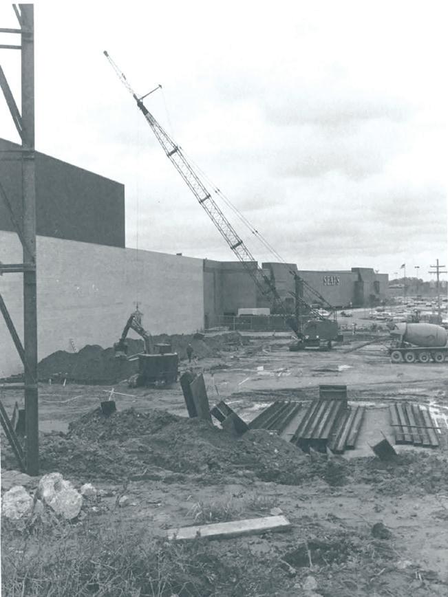 “Shortly after it was built, the rent for storefronts was quite high, and only large stores like Sears were buying up space. The streets around the mall, including Hall Road, were still under construction when it opened. Smaller developers started taking up cheaper space around the mall as it became available.”