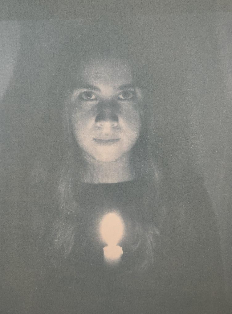 sharpie drawn to form a beard on my mother and a frown over my father’s face. My parents’ eyes are crossed out. I look the same, aside from alien ears drawn above my head. Not sure whether to scream or shudder, I let out a hollow laugh that echoes below the lofty ceiling. Music on the piano has been rearranged, the whole set of Chopin books gone. The piano is shiny and polished, and the covering over the keys carefully closed, though I know it has been played over and over again these last few days.