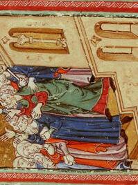 In the Sarajevo Haggadah, the liturgical text is preceded by an entire series of illustrations depicting biblical scenes, from Creation through the Exodus and Mount Sinai. This page depicts the Jewish people crossing the Red Sea.