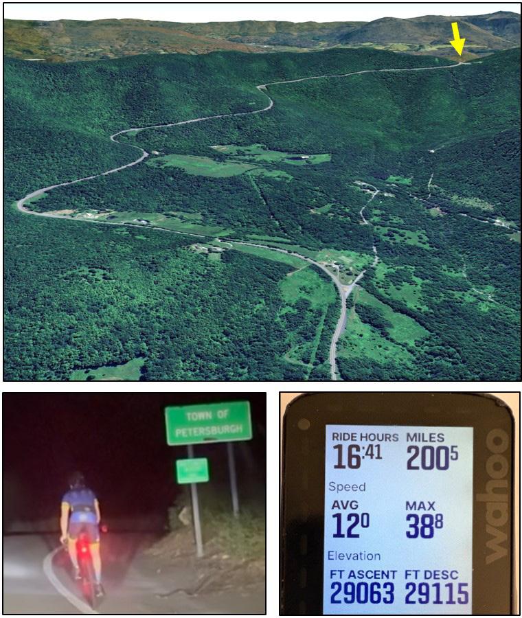Everesting became a ‘thing’ for very avid cyclists during COVID. The challenge is simple: pick any hill and ride up and down, again and again, until your total elevation gain is 29,032 vertical feet (the height of Mount Everest) and complete it within 24 hours. For 2025, I set a goal to attempt an Everesting. After several 10-hour training rides this spring, I completed the challenge on July 5th. I rode a 1,215’ tall hill called Petersburg Pass, which separates NY from MA in the Taconic Mountains. I finish the 24 laps up & down the Pass just after midnight with a total ride time of about 17 hours. In hindsight, I would have done this challenge on a much cooler day, and before I was in my 60’s.