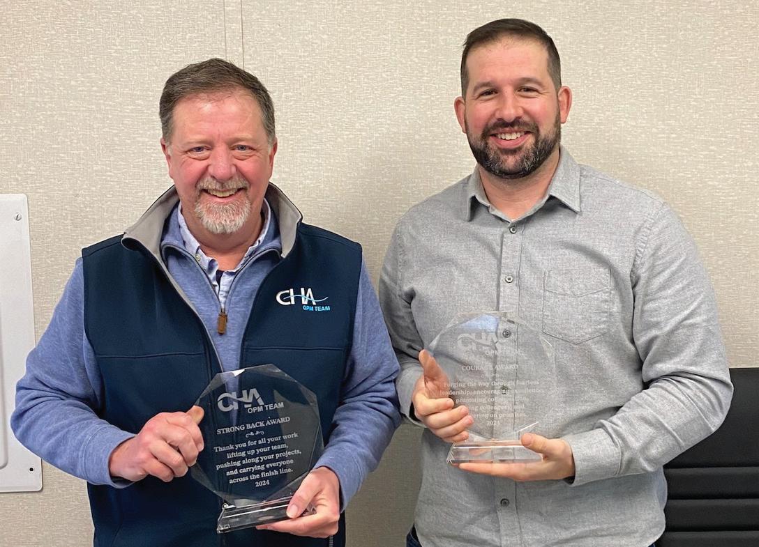 Two CHA employees were recognized recently for their extraordinary efforts on behalf of our clients. Project Manager Dave Hurley was awarded the Strongback Award for his willingness to take on additional responsibilities while maintaining a positive attitude and being the ultimate team player on numerous projects including the Bridgewater Fire Department and Belmont Library. Senior Onsite Representative Rob St. Laurent was awarded the Courage Award for his work with UMass Dartmouth on multiple capital improvement projects, including providing move management services for more than 40 projects across nine buildings on the university campus.