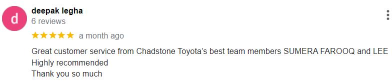 Toouramazingcommunityofcustomerswhostandbesideus,shapingthe spiritofChadstoneToyota,yoursupportmeanstheworldtous,andwe eagerlyanticipatedeepeningourbondaswejourneyforwardtogether. Thankyou.
