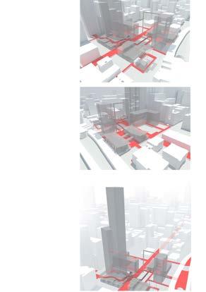 The precint based car park is proposed to be located at the corner of Flinders St and William St. The entry to the car park would be from William st to avoid traffic congestion on Flinders st. The car park has two structures connected via ramps for future proofing. The space within the ramps create East West connection within the block though Custom house lane.