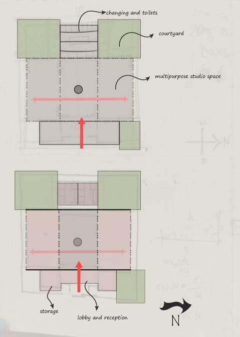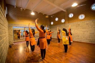 The studios are designed as such it can expand to become bigger performance spaces . The space inturn opens to green courts for individual plactices and chatting. The main enterance opens with the view of 10ft high Natraj sculpture with back drop of stone and water giving spiritual and serene environment.
