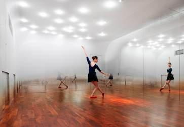 Design a dance studio that incorporates sustainable elements, optimal lighting, and a desirable ambiance, evoking emotions that foster an inspiring space for dance and music practice