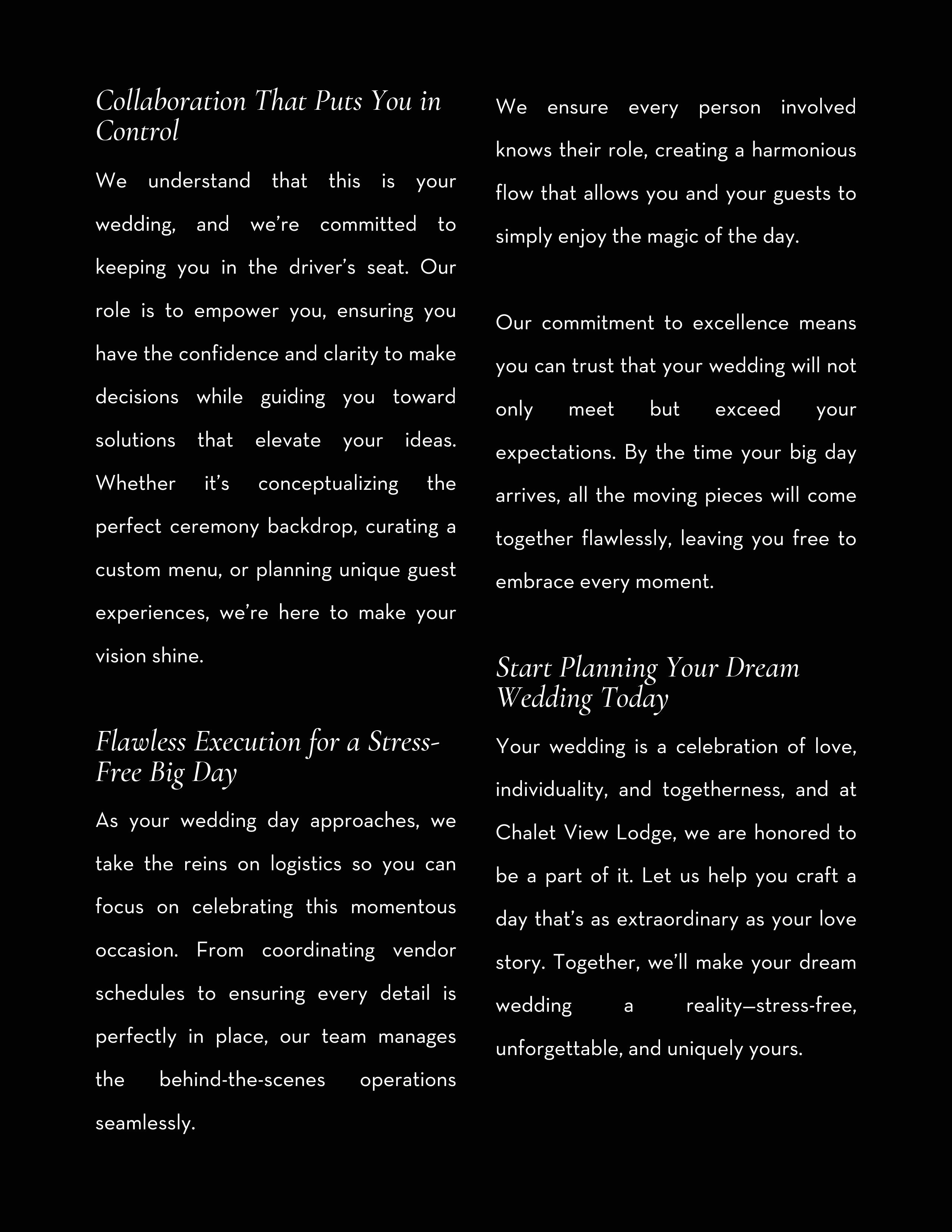 Our Customizable Signature Inclusive Wedding Package provides all the essentials for a stunning destination wedding, with complete flexibility to personalize every detail. From expert florists crafting breathtaking arrangements to lively bands setting the tone, every aspect of your day is tailored for a spectacular celebration. Enjoy the perfect blend of essential services and bespoke customization at our breathtaking lodge venue.