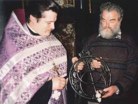 Some Companions will remember Hamish Miller who created the new Well lid with the heart early in this century. Hamish passed over a few years ago. Recently his widow, Ba Miller, sent us this photograph of Hamish in Kiev in March 1991 presenting the Chalice Well lid vesical piscis design to the then Bishop of Kiev with a vial of Chalice Well water attached. St Volodymyrs Cathedral is one of the oldest Christian centres, founded in 988AD. Ba is hoping one of her Ukranian friends will be able to visit the Cathedral soon to see if the lid is still on display.