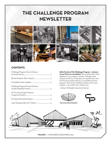 Our new 14,000 sq. ft. furniture manufacturing workshop (The Gibbs Center) will triple CP Furniture’s capacity and significantly expand training and employment opportunities for alumni. The Gibbs Center was designed by DIGSAU, which also designed our awardwinning Construction Training and Education Center (CTEC). Challenge Program trainees and staff have built a good portion of it, including the dramatic timber frame. The majority of the project has been completed; HVAC, sitework, and finishes are underway. We are in the home stretch and are still raising funds to complete the building, move in, and cover operating costs as we ramp up to full capacity. We hope to relocate our equipment and staff and be fully operational by the end of March. Please come see our progress at 1136 East 7th Street!