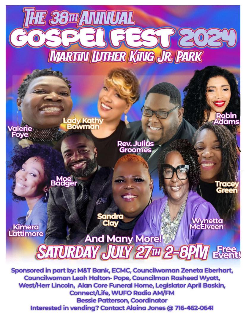 38TH ANNUAL GOSPEL FEST Saturday July 27 Martin Luther King Jr. Park 2- 8 p.m. For vendor space call Alaina Jones at 716-462-0641.