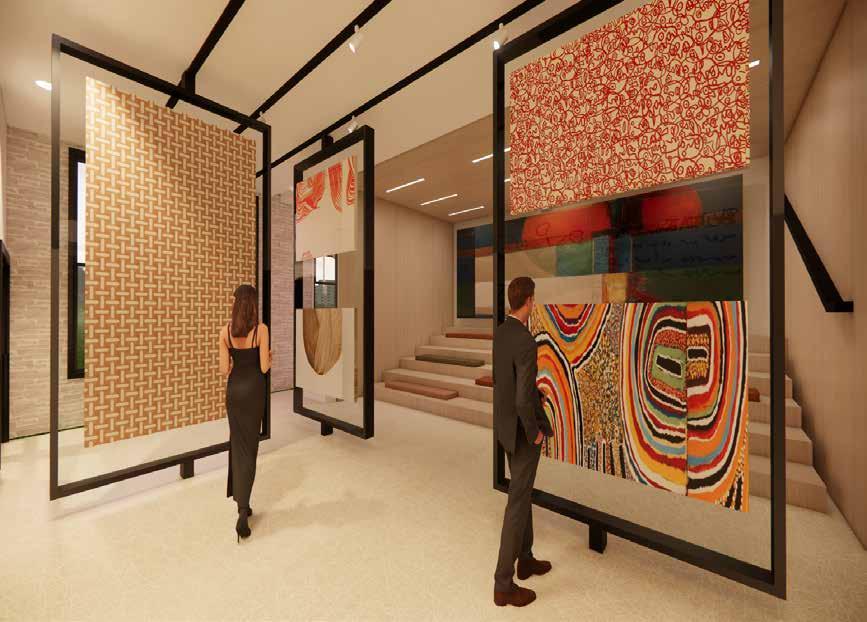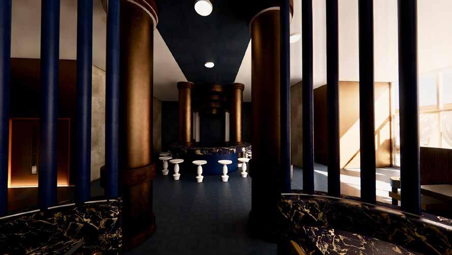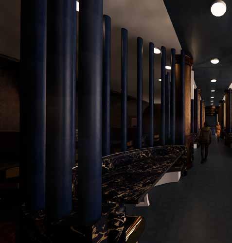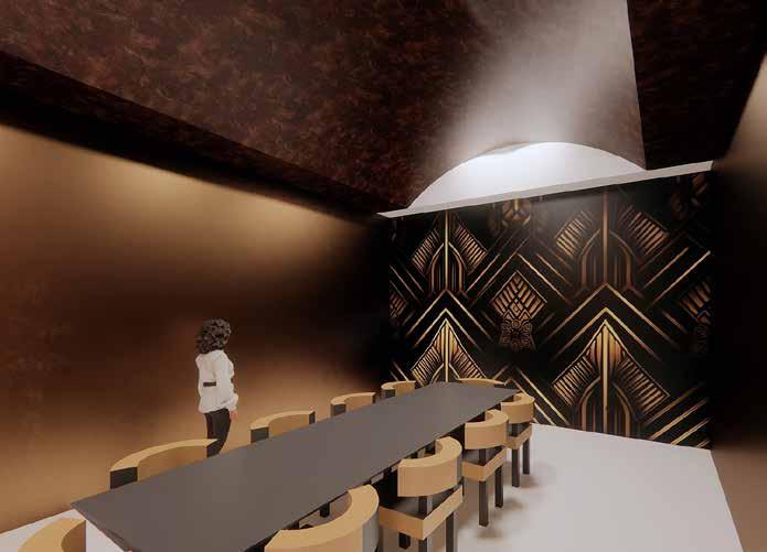 Theentrancehallwayoffersanimmersiveexperience,blending the vibrant street art of Wynwood with the timeless elegance of Egyptian artistry. Designed as a waiting area, it captivates guests with its visual storytelling, engaging them with the restaurant’s cultural narrative as they await their table.