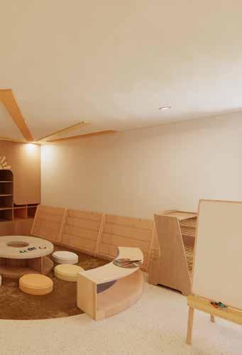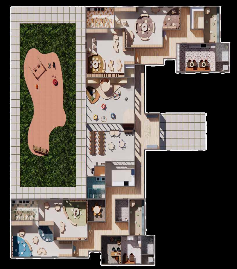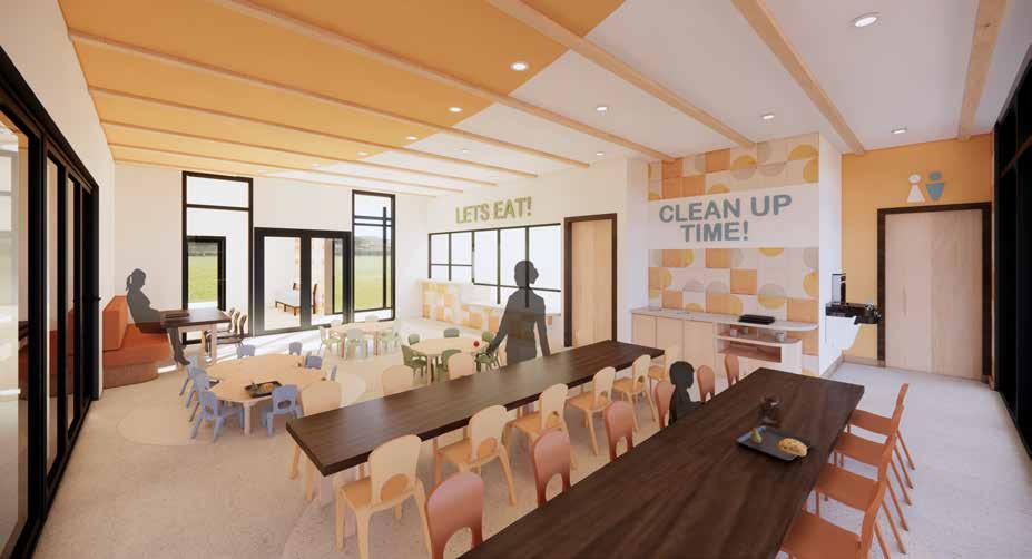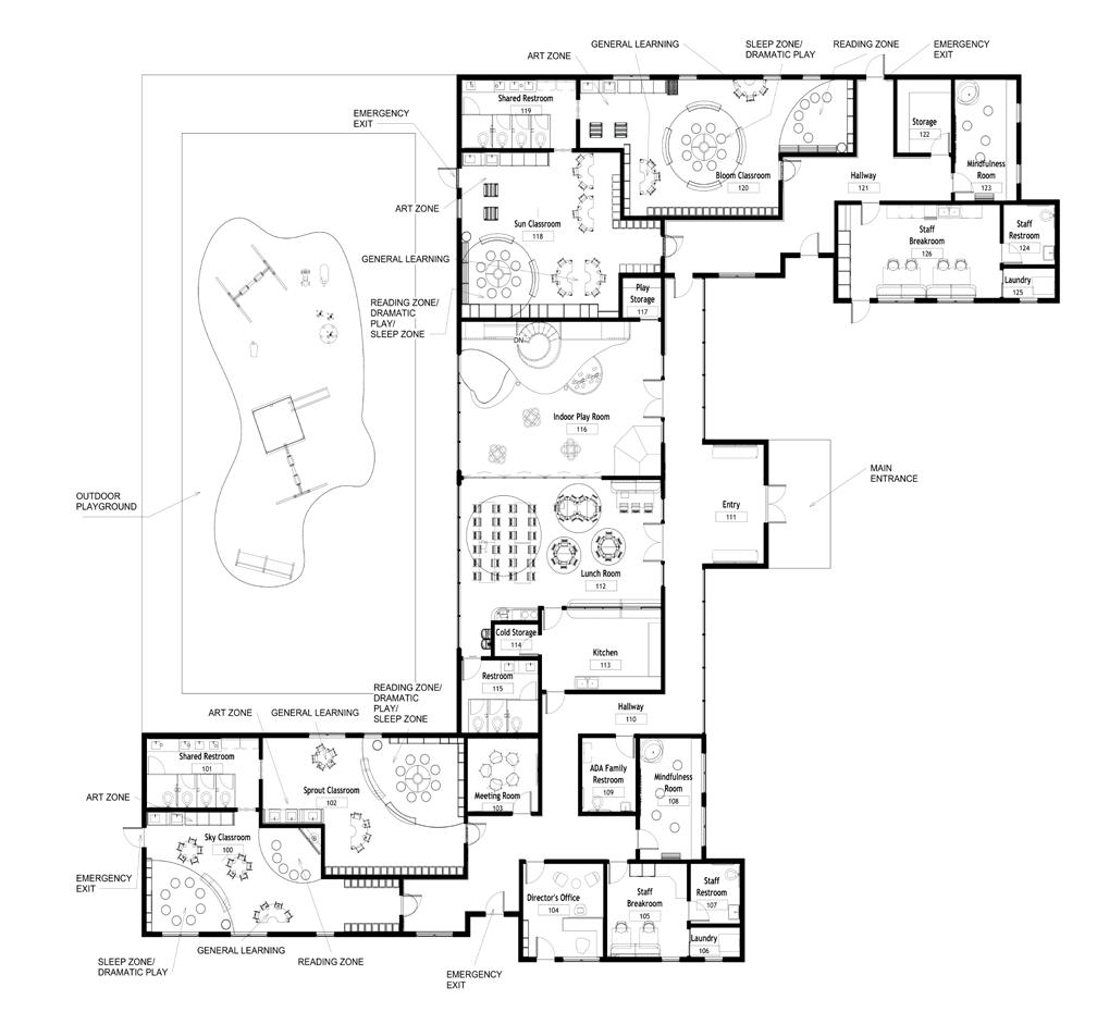 This educational facility provides a comprehensive and inviting environment tailored to the needs of students, staff, and visitors alike. It features versatile classrooms, and administrative spaces including a director’s office and meeting room, as well as amenities like a breakroom and laundry facilities for staff convenience. Tranquil mindfulness rooms offer moments of relaxation, while communal areas like the lunch room and kitchen facilitate social interaction. Children can enjoy the indoor playroom with adjacent storage. Throughout the building, accessibility is ensured with conveniently located restrooms. This facility fosters a holistic educational experience, promoting learning, well-being, and community engagement.