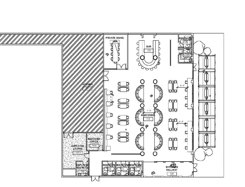 The proposed site plan integrates four key structures: the Main Building, Carriage House, Rhythm & Blues space, and the Communal Fusion Building. These buildings are thoughtfully arranged around a central monumental fountain, serving as the focal point of the design and enhancing the site’s visual appeal. The plan includes 41 parking spaces and well-connected sidewalks to ensure accessibility and ease of navigation for visitors. A designated area for a small farmers market adds a dynamic community element, encouraging local engagement and interaction. The overall design creates a functional, vibrant, and inviting environment that balances practicality with a sense of place.