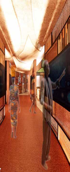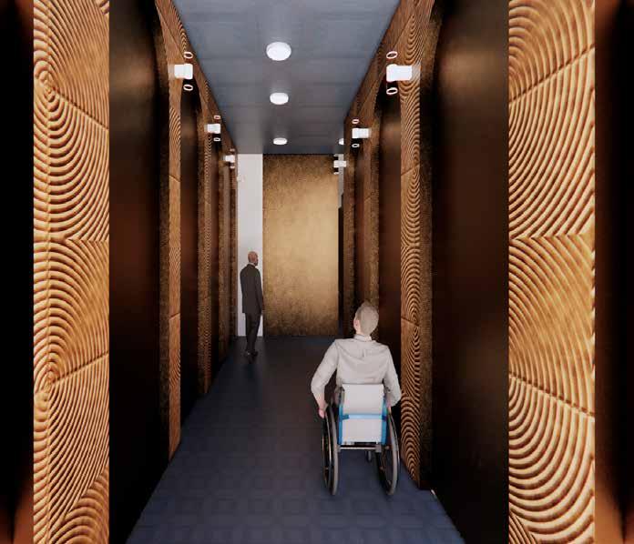 The floor plan draws inspiration from ancient Egyptian symmetry, creating a regal and harmonious ambiance. Spacious hallways, ranging from 4 to 8 feet wide, ensure accessibility for wheelchair users, while six ADA-compliant all-gender bathrooms enhance inclusivity and universal design.