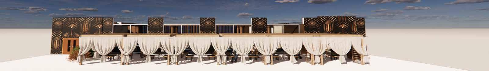 The outdoor dining area captures the essence of ancient Egyptian opulence with white fabric curtains reminiscent of royal outdoor gatherings. This space seamlessly blends historical elegance with Miami’s vibrant energy, offering a luxurious yet relaxed atmosphere.