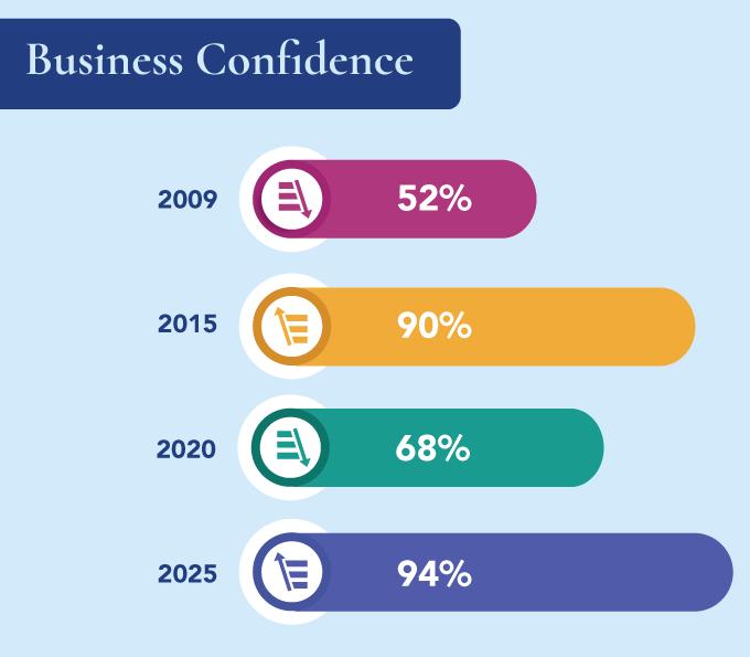 In 2009, only 52% of businesses surveyed felt confident about the future of their business. The impact of economic recovery in the years that followed is clear, with 90% of responding businesses expressing confidence by early 2015. By 2025, the comparable figure had risen to