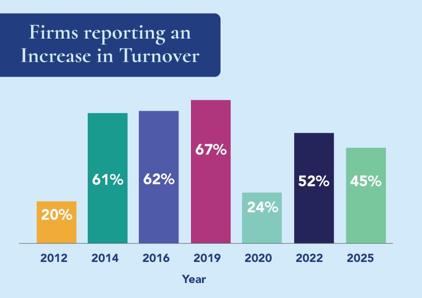 Reported turnover paints a similar picture; in 2012, the number of firms reporting an increase in turnover was just 20%. Increasing steadily in the following years, this figure had risen to 62% by 2016, and to 67% by 2019. However, the impact of the pandemic on business was evident, with those reporting an increase in turnover falling to just 24% in 2020. By 2022, this had recovered to 52%. In recent years, this figure has remained static, sitting at 45% in the mostrecent survey.