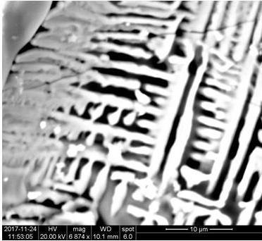 FIGURE 4. Three spinel grains surrounded by grossite bars and white structures in the background