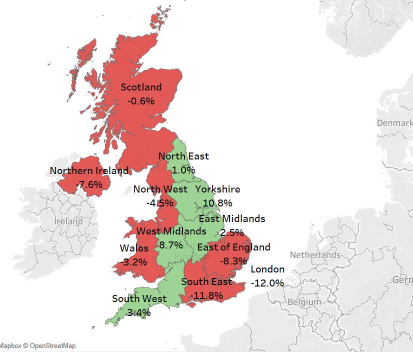 The pattern of sales on a regional basis in the UK and Northern Ireland is shown in the map above for sales from January to August, compared with the same period in 2021. This also shows a mixed pattern. The strongest sales so far this year continue to be in Yorkshire, at nearly 11% up on last year’s levels. In contrast, London and the south-east of England regions have seen the weakest sales at close to 12% down on last year’s levels.