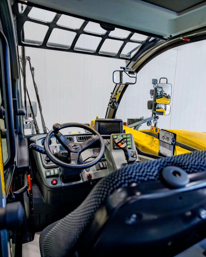 steering column and ample space behind the operator for storage. A generous shelf between the front window and steering wheel carries air vents, USB charging in addition to space for paperwork and site documentation.