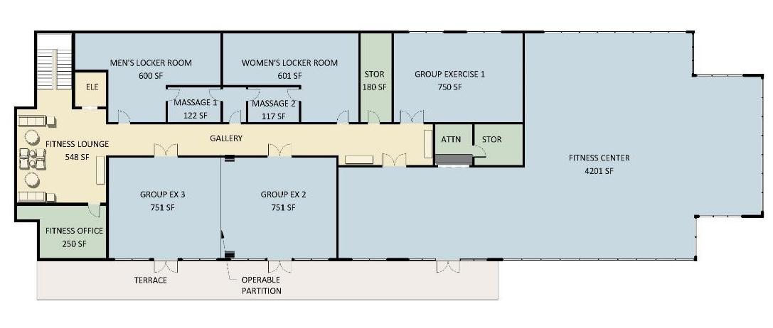 • Dedicated group exercise classrooms for boutique-style offerings (i.e. Spinning, Pilates) as well as flexible spaces for yoga, HITT training, etc.