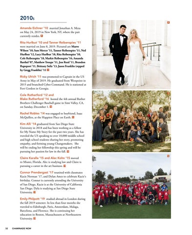 Amanda Eichner ’10 married Jonathan A. Meza on May 24, 2019 in New York, NY, where the pair currently resides. 8 Rita Hurlbut '10 and Tanner Reibenspies '11 were married on June 8, 2019. Pictured are Maeve Wilson ’10, Sam Mercer ’11, Tanner Reibenspies ’11, Ned Hurlbut ’12, Lucy Hurlbut ’18, Rita Reibenspies ’10, Cole Reibenspies ’18, Markie Reibenspies ’16, Amanda Barthel ’07, Matthew Troupe ’11, Jess Reed ’11, Brandon Rapoport ’11, Brittany Solis ’13, Jason Franklin (repped by Gregg Franklin) ’11 9 Ricky Ulrich '11 was promoted to Captain in the US Army in May of 2019. He graduated from Westpoint in 2015 and branched Cyber Command. He is stationed at Fort Gordon in Georgia. Cole Rutherford ’12 and Blake Rutherford ’16 hosted the 4th annual Ruther Brothers Challenger Baseball game in Simi Valley, CA, on Sunday, December 1. 10
