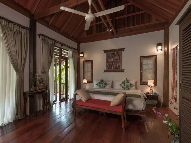 客房设计典雅,家具为老挝殖民时期风格,但是设 施现代。客人可以选择入住水上小屋或豪华客房,窗外 景色优美、氛围宁静。