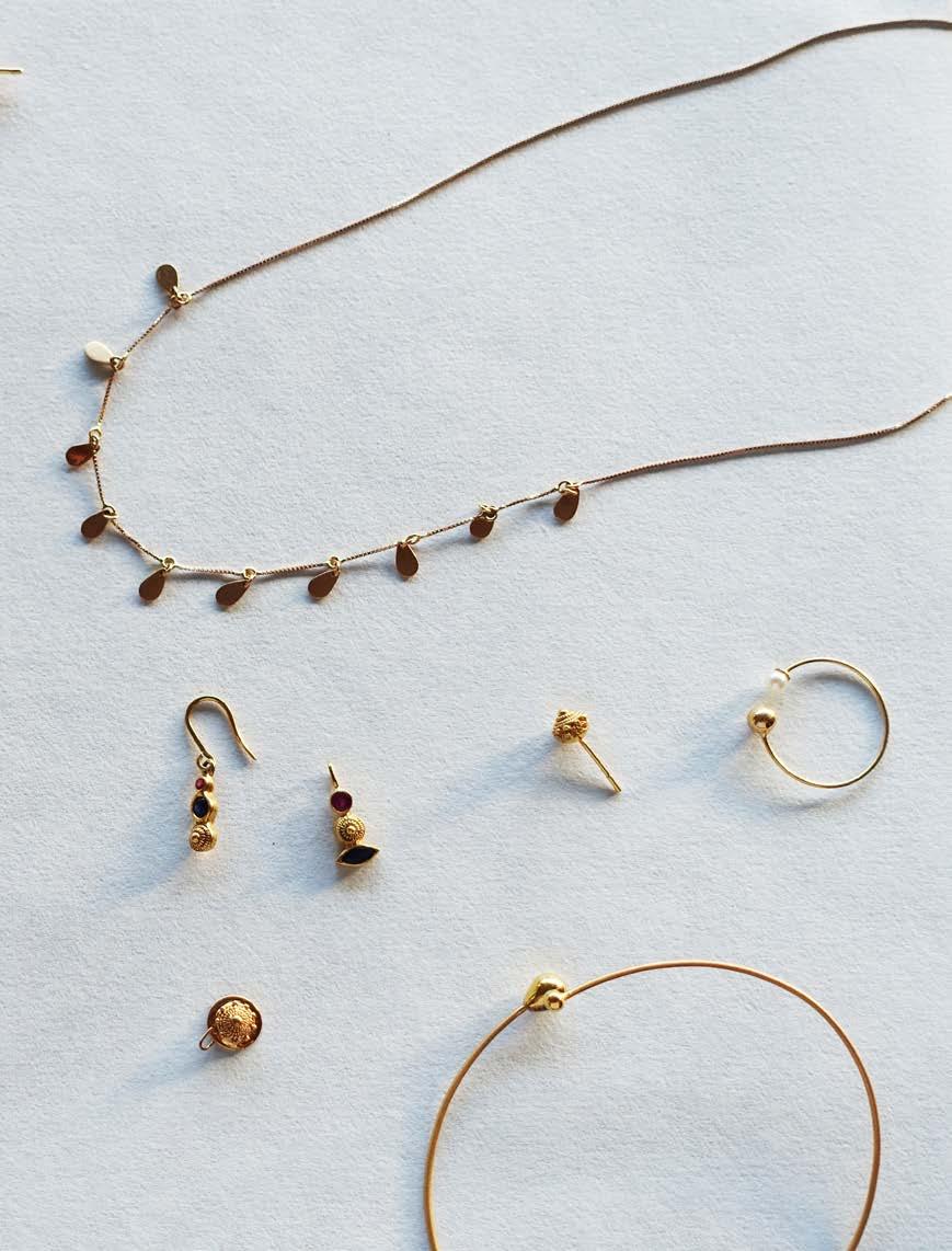 2: The Monsoon and the Banyan Leaves necklaces, the Naga bracelet, and the Pagoda earrings