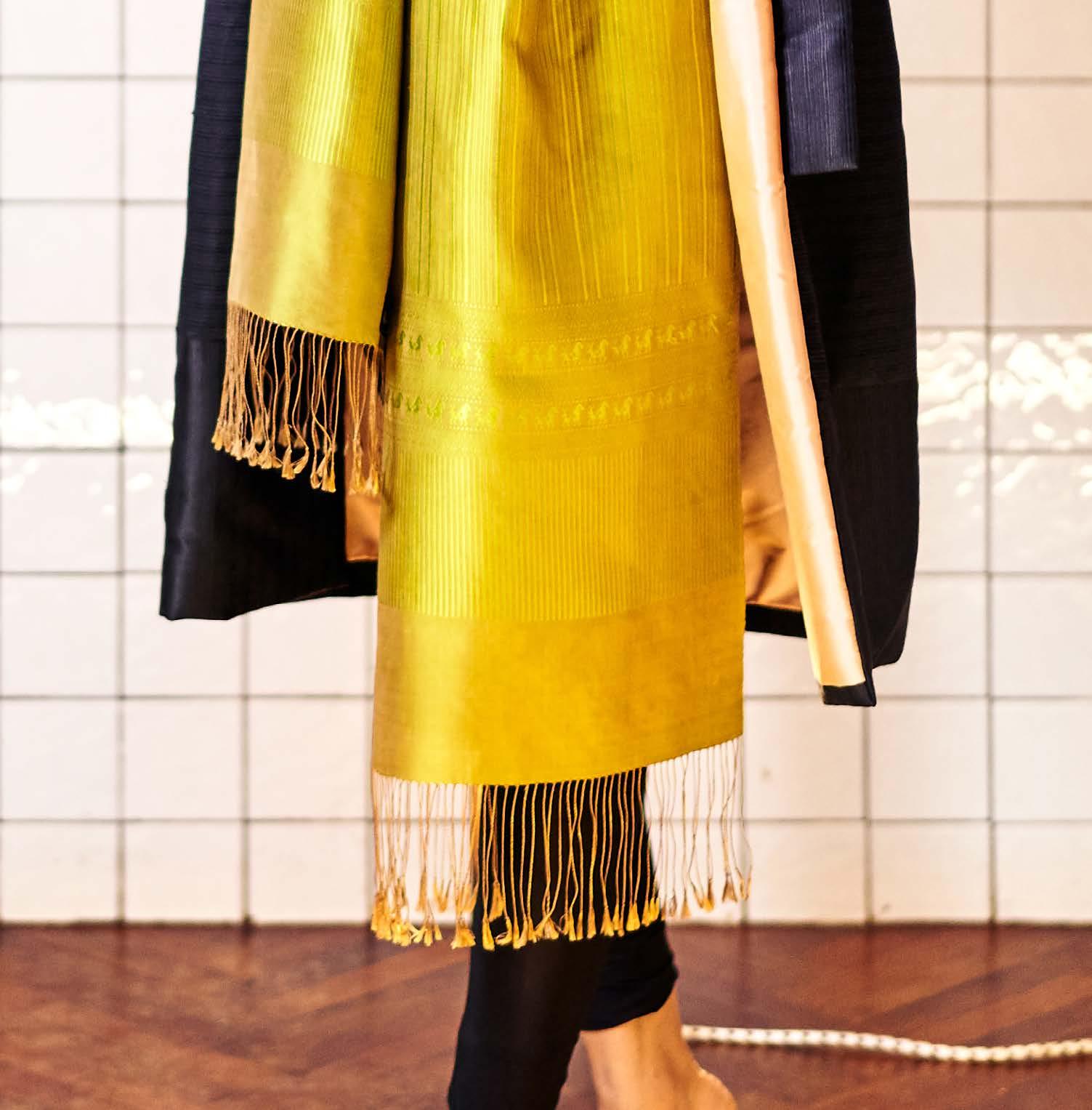Oudone Precious Silk, based in Vientiane, has been creating high-quality garments based on Lao heritage knowledge and aesthetics since 2001. It was formed by a mother and daughter duo, Oudone and Vanida, who resided in France for several decades. Oudone returned to Vientiane in 1989 and Vanida in 2012, and since then they are leaning toward a contemporary design direction even if they continue to produce traditional items like the Sinh, the Lao tube skirt worn by office workers and during Buddhist rituals across the country. The French influence is naturally visible in their collection where the use of gold thread is a key component. The gold thread produced in Lyon is a centuries-old craft that was prominent in the textile trade in France and worn by royal family members in Laos. Oudone and Vanida's approach is infused with ancestral cultural knowledge and skills while seeking to sustain the depth of the Lao culture alive for the generations ahead through contemporary designs.