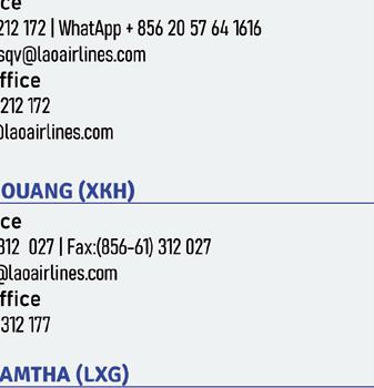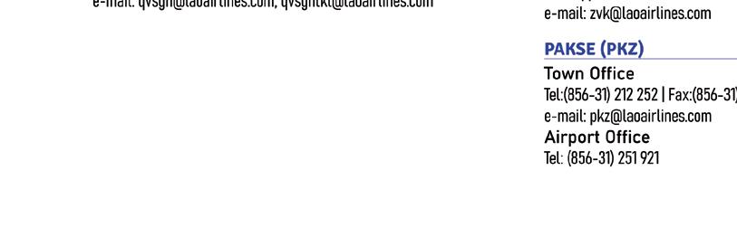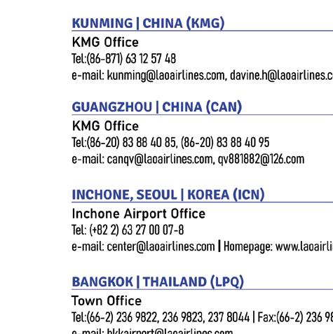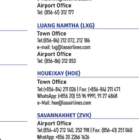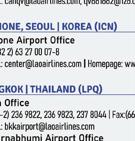 Headquarters Wattay International Airport Vientiane Capital, Laos Tel: (856-21) 513243-46, Fax: (856-21) 513247 www.laoairlines.com