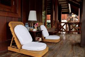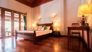 瞰南咖河。私人露台上方有斜顶遮蔽,就坐落在河流 的巨石上方,远处是茂密的竹林。我的房间宽敞而时 尚,床头板、台灯、家具和浴室镜框都由竹子元素装饰。