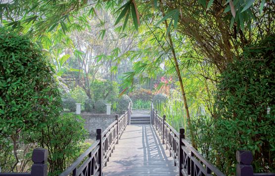 酒店大堂非常吸引人,让我惊叹不已。高挑的大 厅内有一盏巨大的吊灯,吊灯由悬空的长竹管制成。 前台上吊挂着数百个细长彩色布条,风中缓缓飘荡, 宛若一件令人眼花缭乱的艺术品。宽敞的大堂出口直 通一个青绿色的无边泳池,泳池位于河流上方,远处 就是茂密的森林。