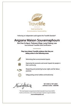 Travelife is a certification program for accommodations and tour operators that promotes sustainable tourism practices. To become Travelife Certified, a business must undergo a rigorous assessment that evaluates its environmental impact, social responsibility, and cultural preservation practices. Local businesses are provided with free training and coaching to become certified by the SUSTOUR Laos project which is funded by the European Union.